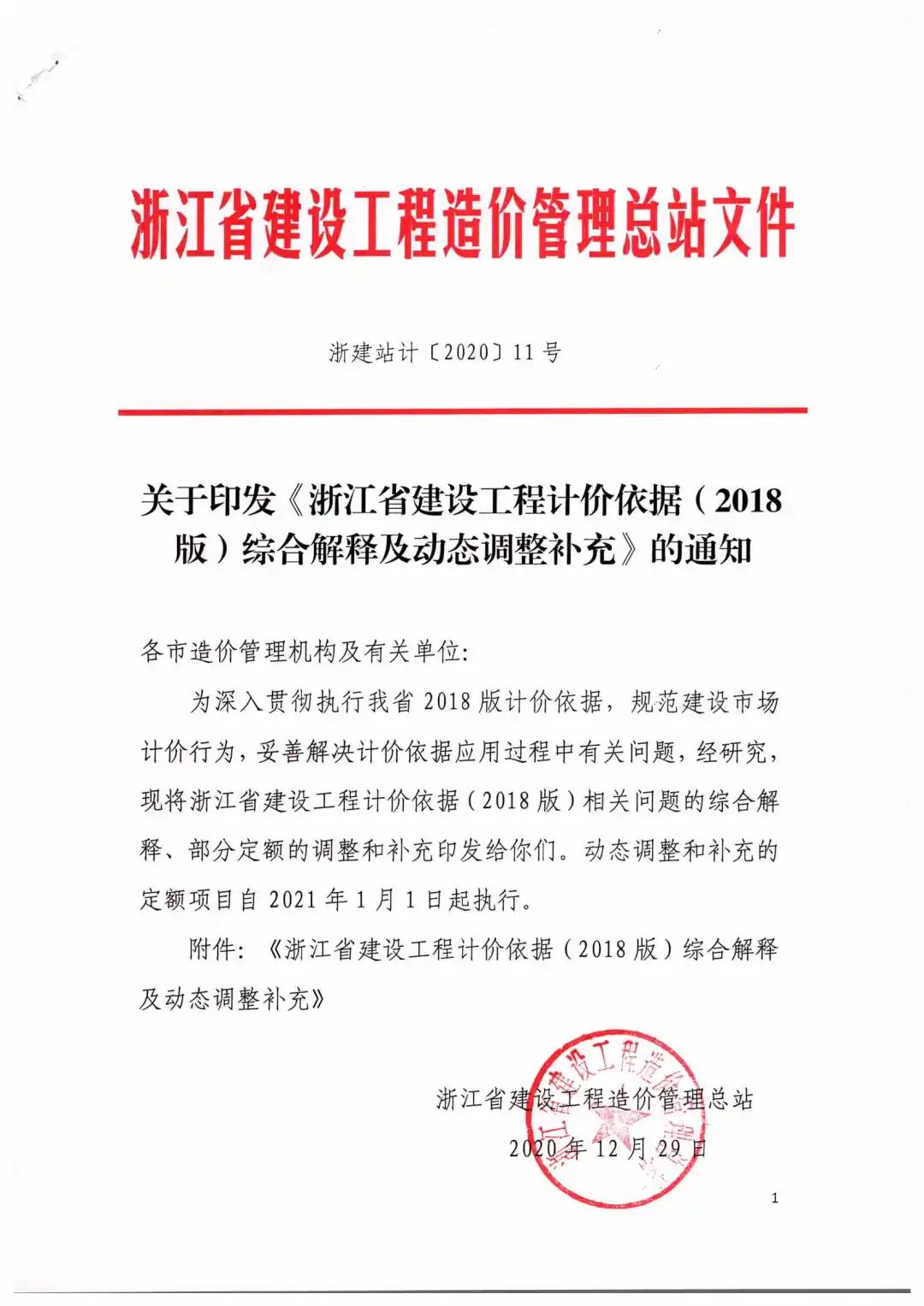 浙建站計[2020]11號關(guān)于印發(fā)《浙江省建設(shè)工程計價依據(jù)(2018版)綜合解釋及動態(tài)調(diào)整補充》的通知
